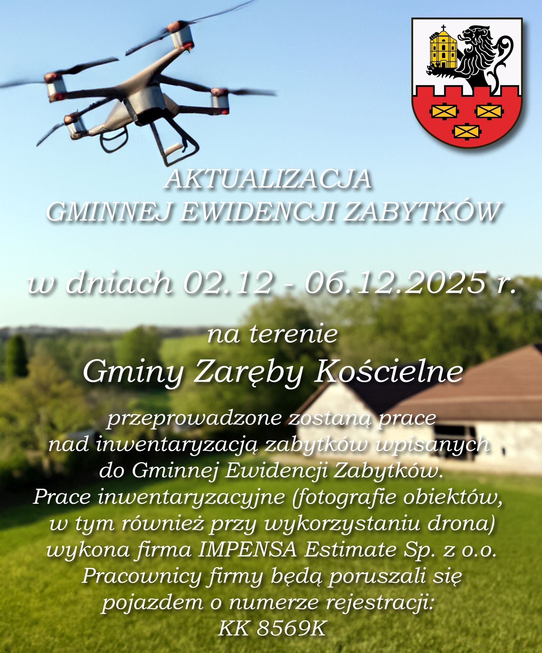Pracownicy firmy w dniach 2-6 grudnia 2025 roku będą przeprowadzali terenowe prace polegające na wykonaniu inwentaryzacji zdjęciowej (w tym nalotu dronem) z zewnątrz obiektów przewidzianych do ujęcia w zaktualizowanej gminnej ewidencji zabytków.
