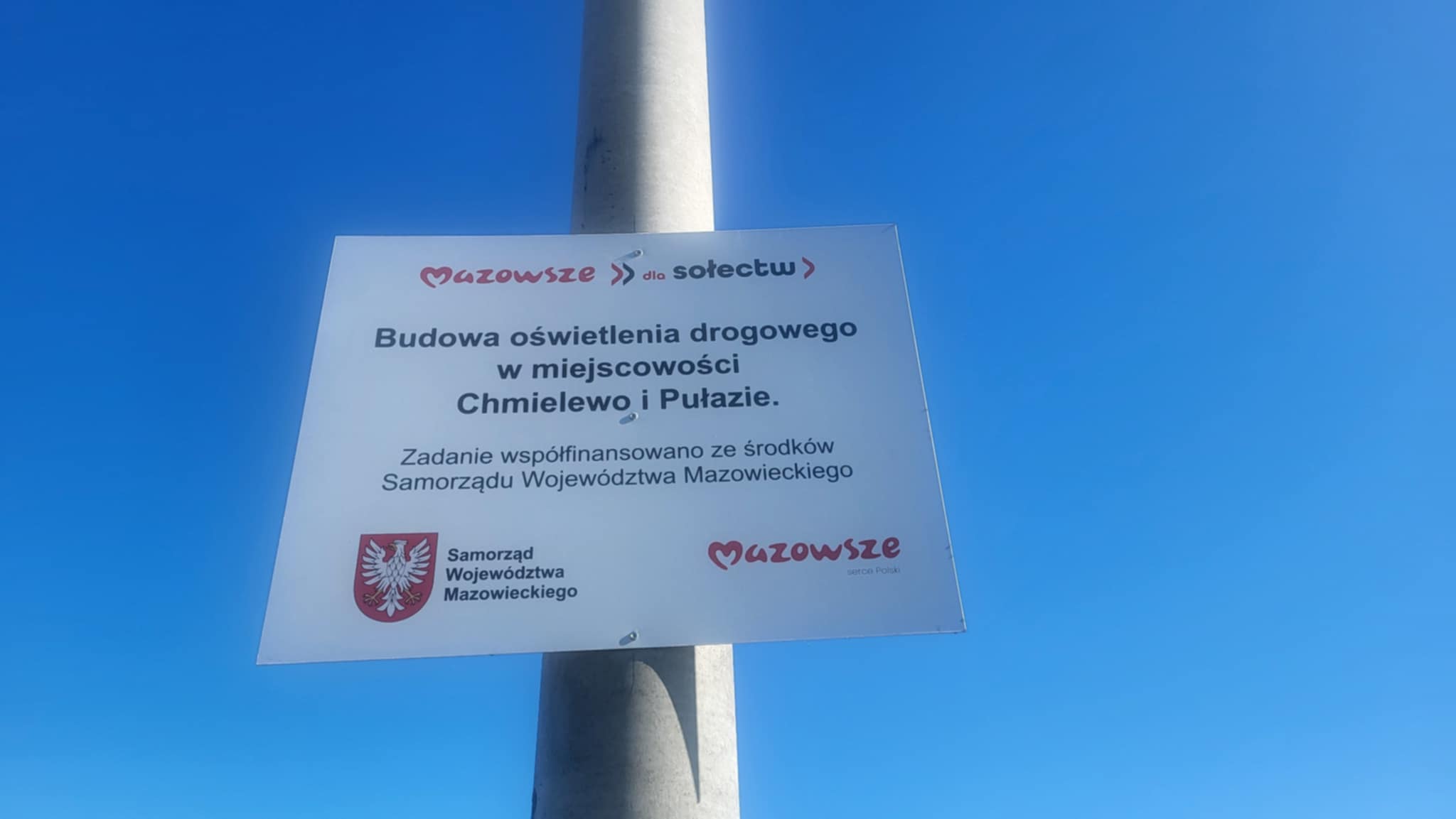 Z przyjemnością informujemy, że w ramach ,,Mazowieckiego Instrumentu Aktywizacji Sołectw MAZOWSZE 2025”- ,,Mazowsze dla sołectw 2025”, zostało zrealizowane zadanie pn. „Budowa oświetlenia drogowego w miejscowości Chmielewo i Pułazie”