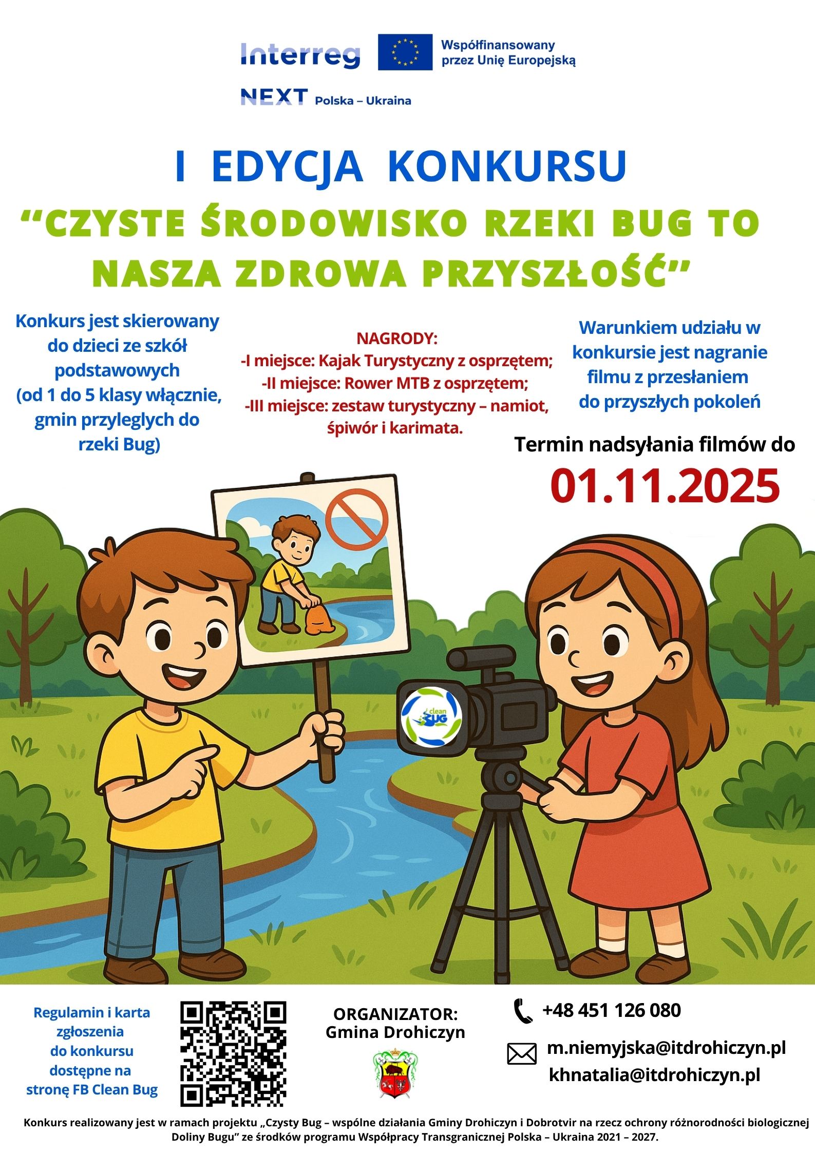 Zapraszamy uczniów klas 1–5 szkół podstawowych z gmin przyległych do rzeki Bug do udziału w I edycji konkursu filmowego, który organizują w ramach projektu „Czysty Bug – wspólne działania Gminy Drohiczyn i Dobrotvir na rzecz ochrony różnorodności biologicznej Doliny Bugu” ze środków programu Współpracy Transgranicznej Polska – Ukraina 2021 – 2027, nr PLUA.01.03-IP.01-0002/23”